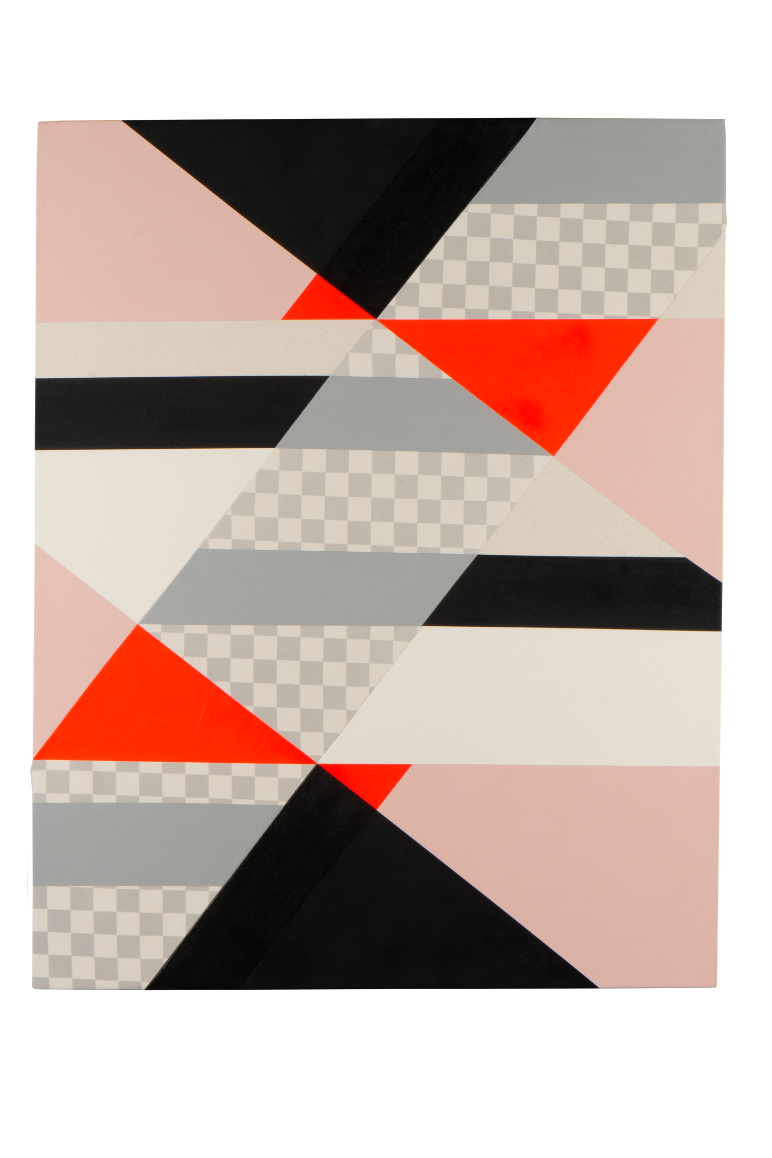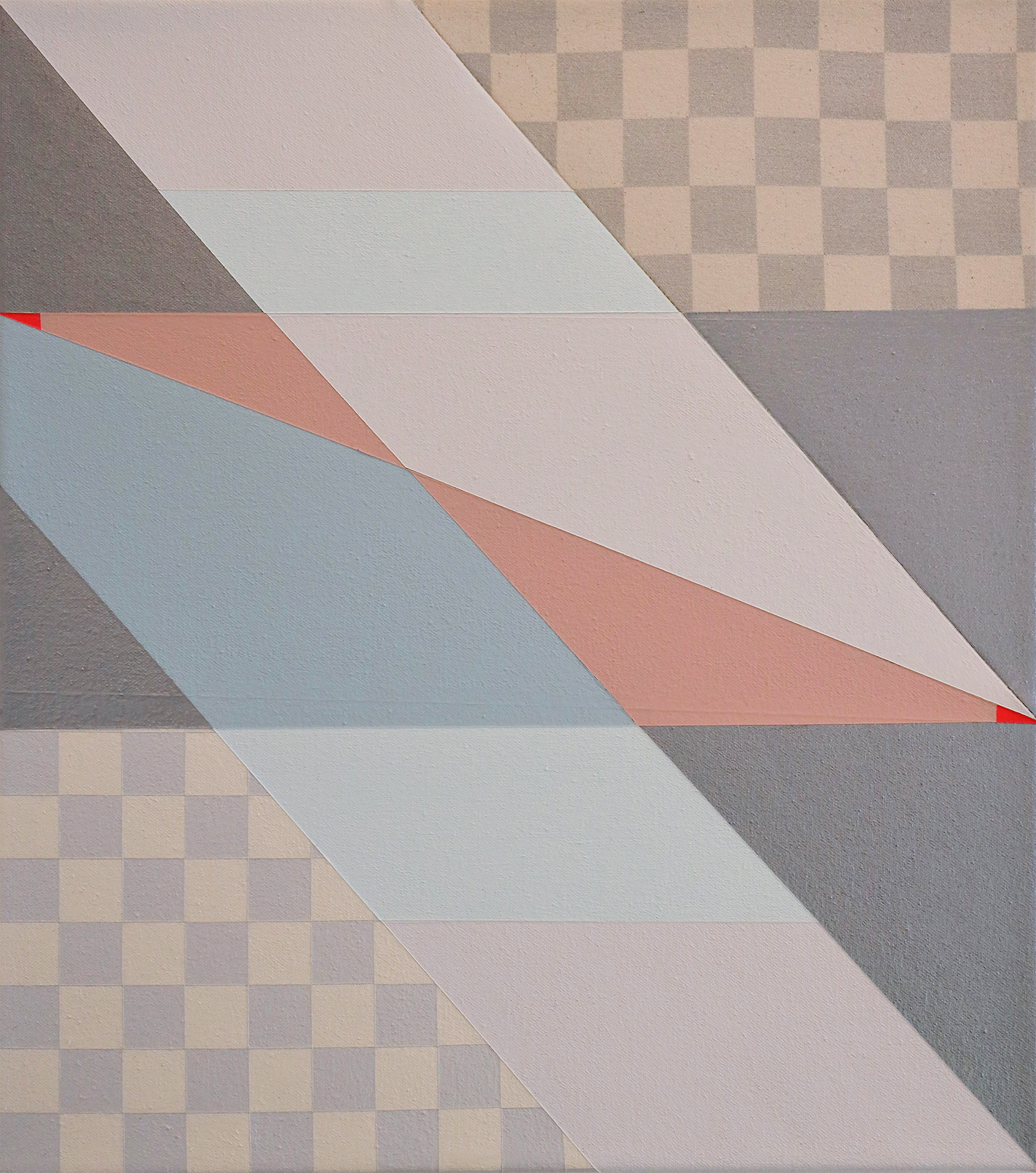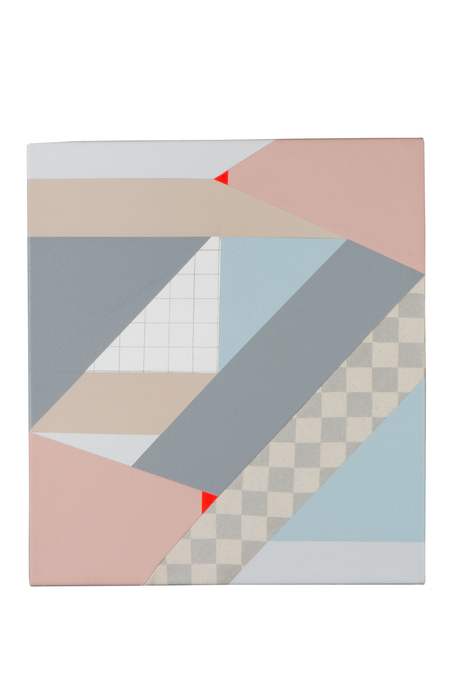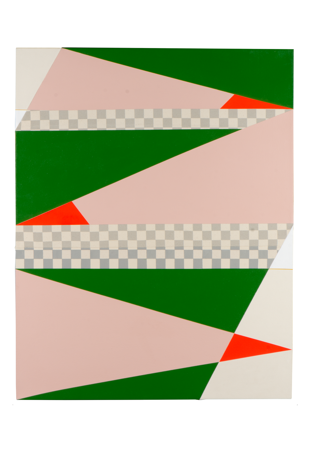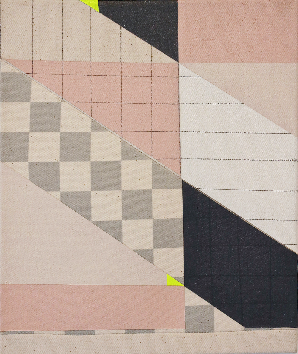 Barcio sewed the surfaces of these paintings together from a mix of raw canvas and strips of fabric bearing a grey and white checkerboard pattern. She uses the checkerboard both to allude to abstract art history, and as a concrete manifestation of the checkered background digital designers recognize as a symbol of emptiness waiting to be filled.