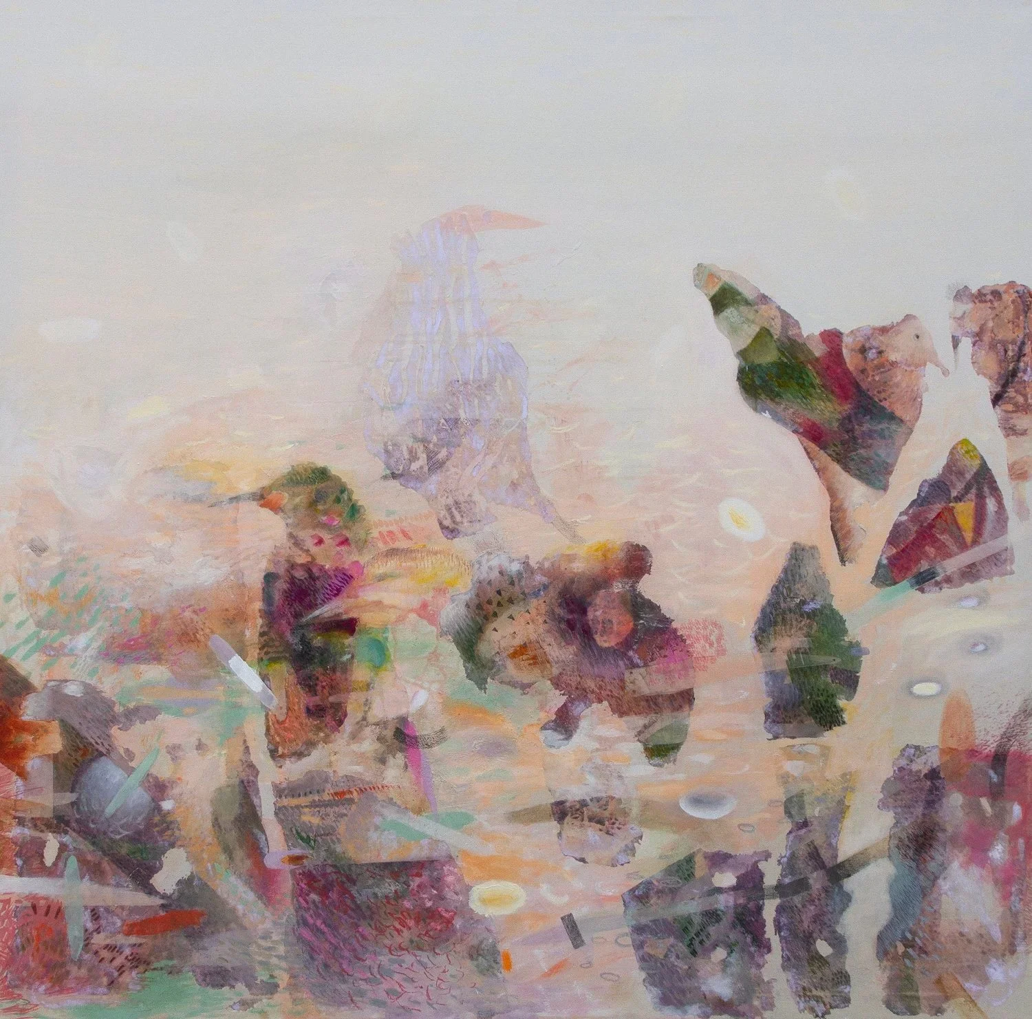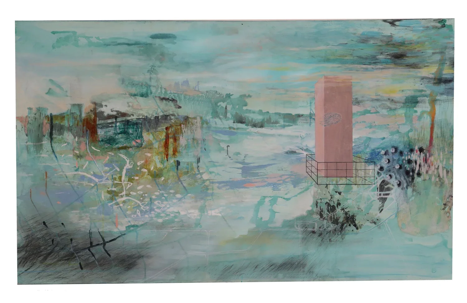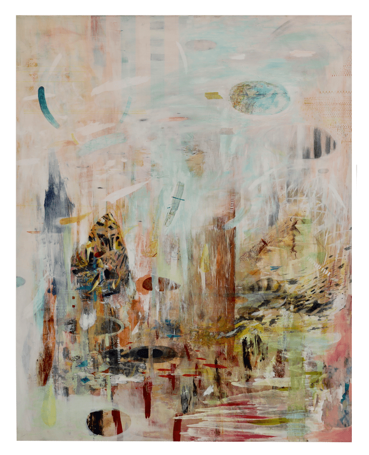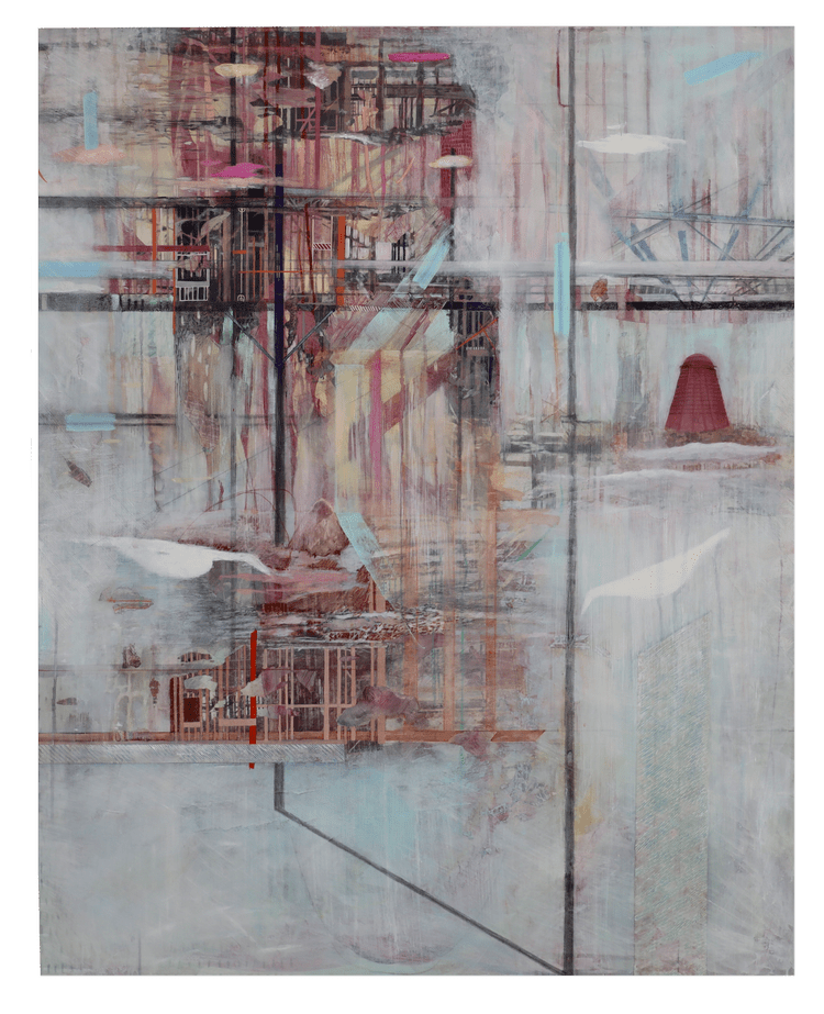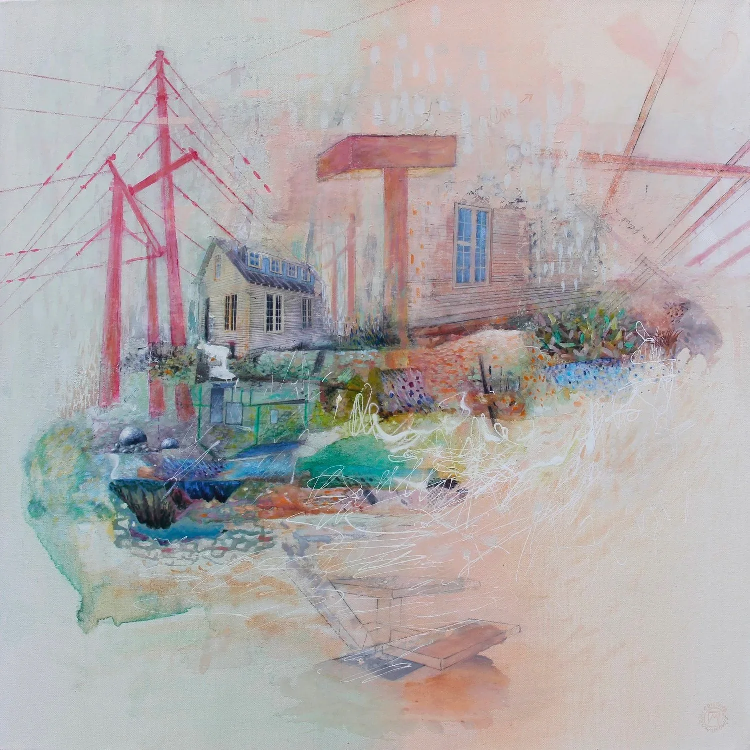 In this new work, Marian leans into the rapid changes experienced by her community that weave through intimate personal experiences of the past two years. There are the skeletons of new buildings fading into turbulent mark making and textures that inhabit the negative space- though never receding, always fighting to come to the foreground and be heard. There are fragments of Marian’s intimate histories, hazily coming to the surface but always with a tether to an architectural framework outside of self. This series showcases her fluidity of belonging. Marian says, “Since moving to Bozeman in January of 2014, I have gradually developed a sense of place, belonging and purpose….[but] I flow in-between communities, local, global, intra-personal.”