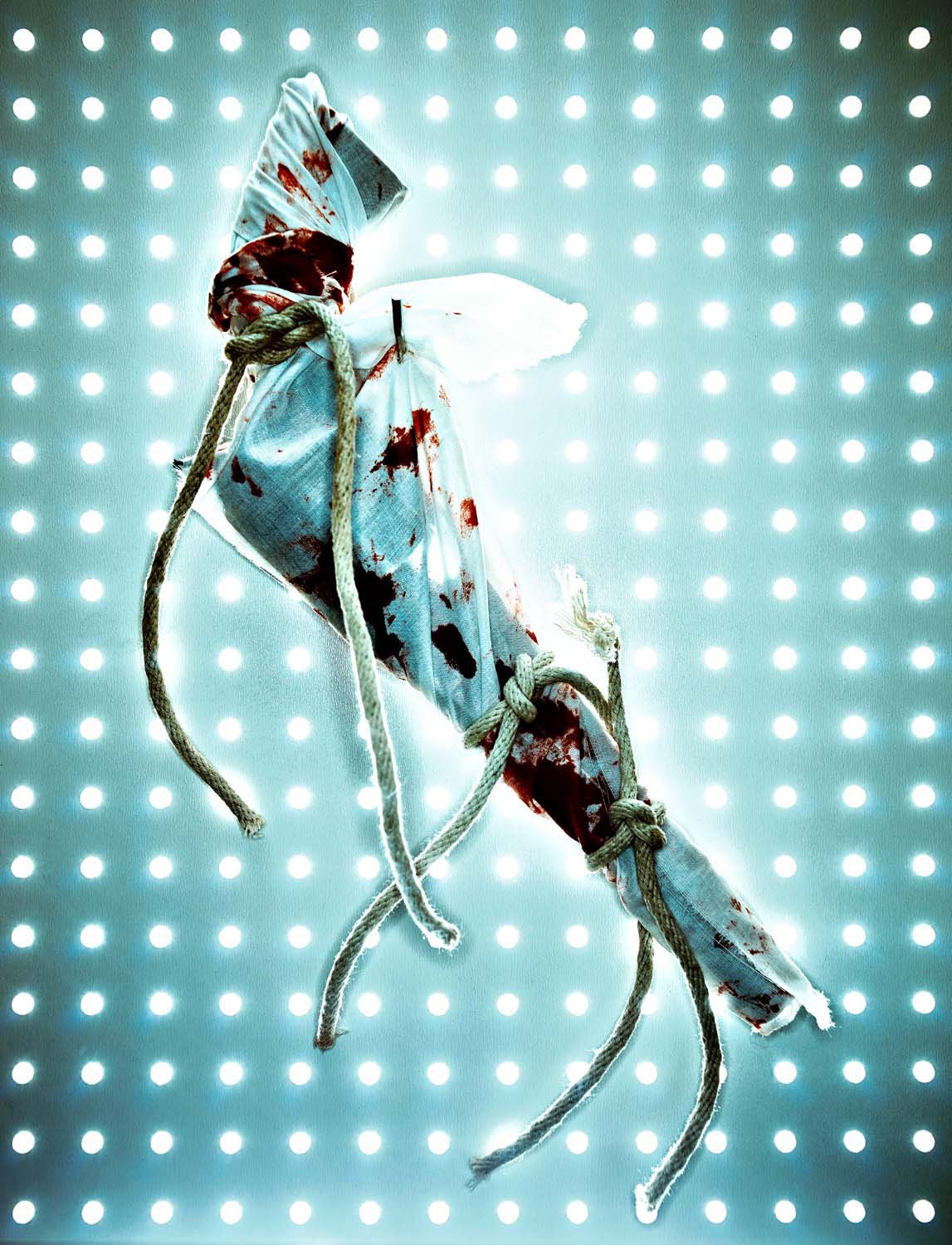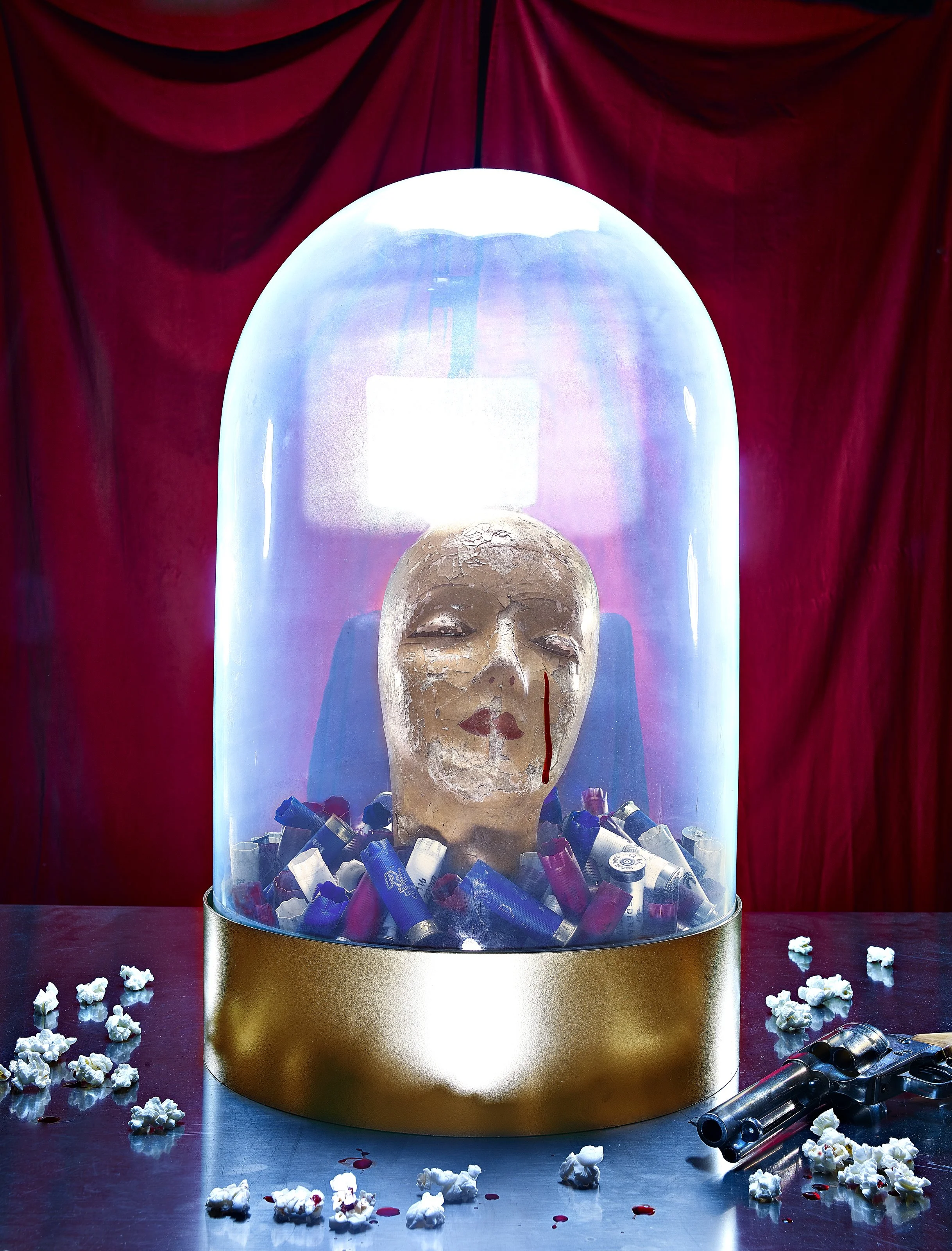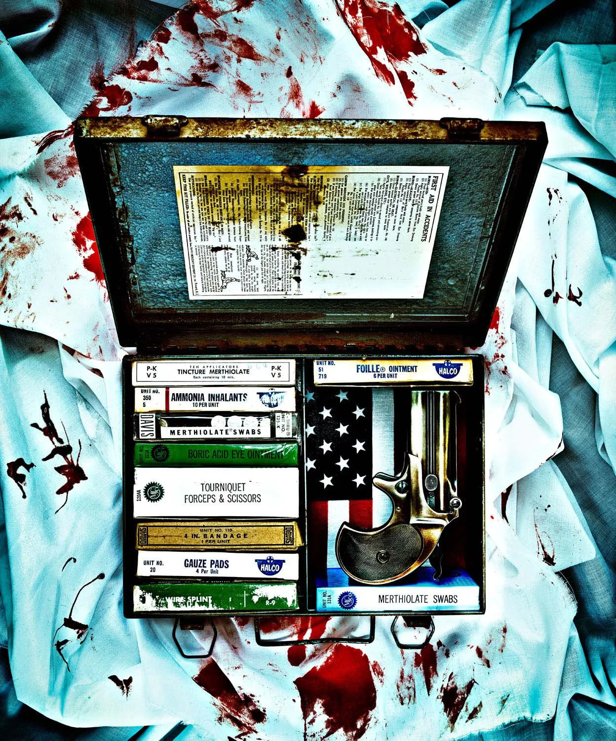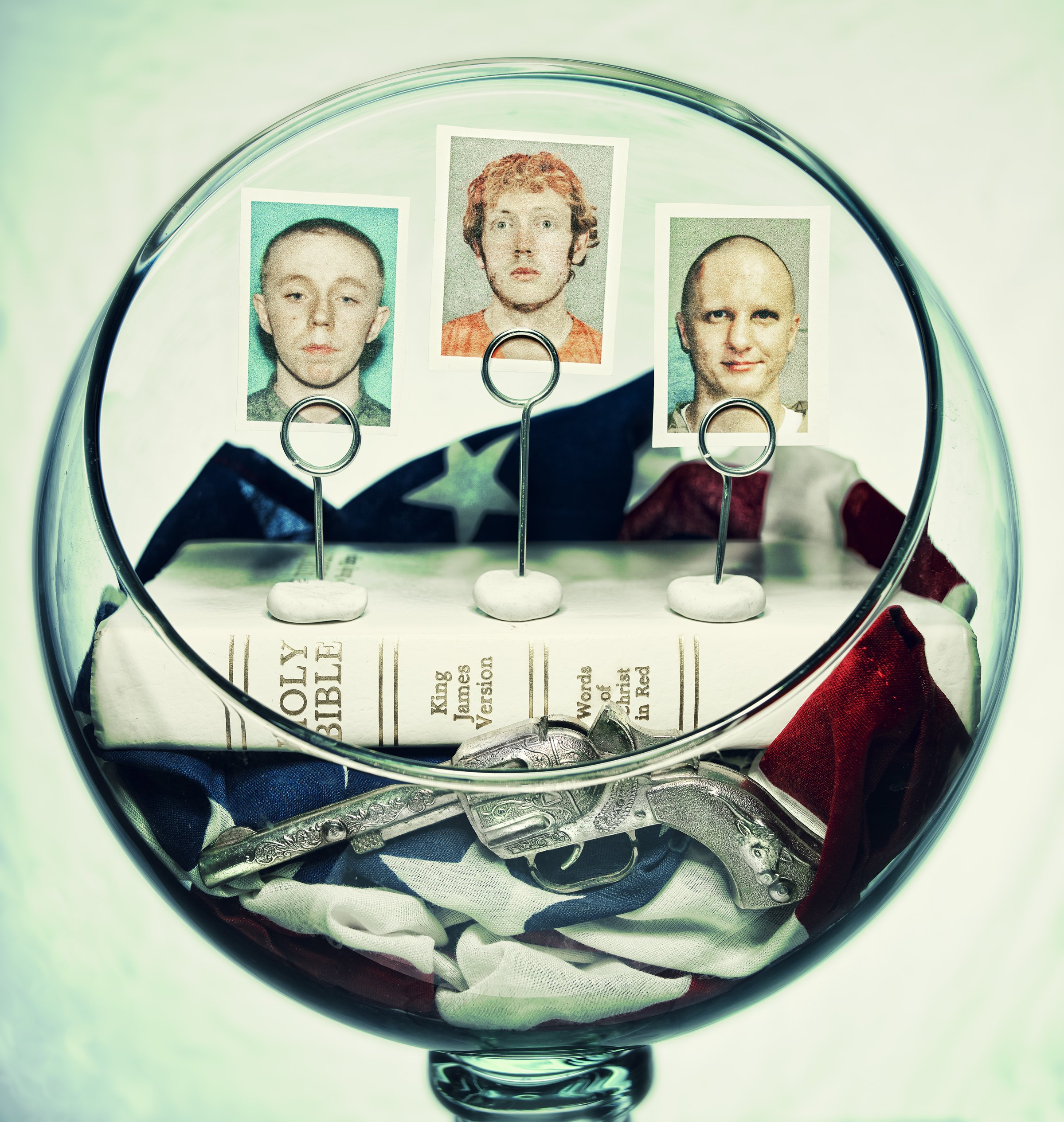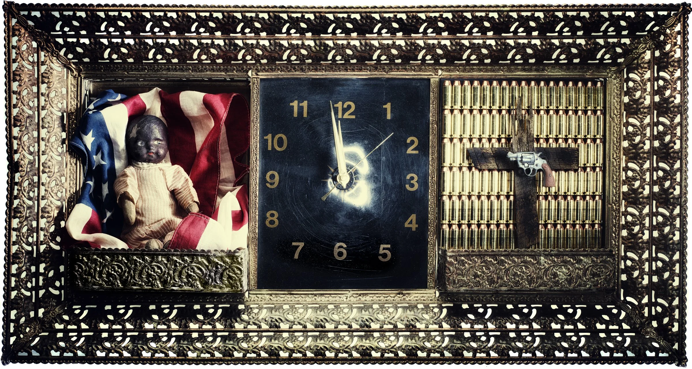 “...I laid the gun on top and took a test shot in color. It was then that something snapped. The image still didn’t really communicate anything to me, (other than being pretty) but I felt that I was going in the right direction. I would go on to use the guns illustrating my thoughts on the absence of sane policy in the United States. For the rest of that year, I spent hours upon hours wandering antique stores and junkyards looking for props to build the sets. The lighting became a paramount component of the 18 images that followed; harsh light, both frontal and from the side, with loud, tweaked and saturated colors.