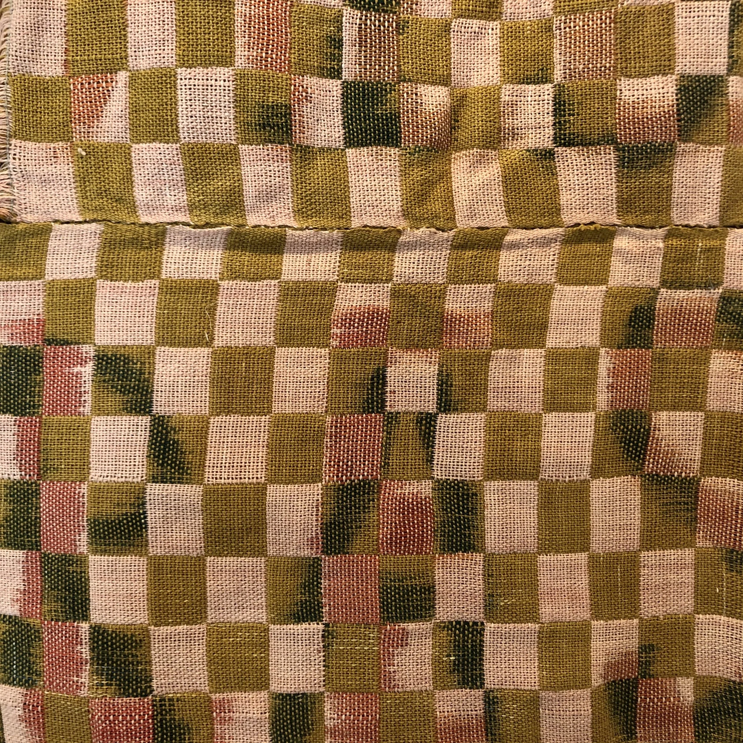 Alayna Rasile Digrindakis: Moving Blanket | Naturally Dyed Linen, Vintage Fabrics, Cotton Gauze and Seeds | 45 x 37 in.